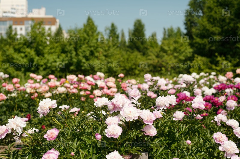 Цветущие цветы пиоников растут в саду в солнечный летний день на свежем воздухе