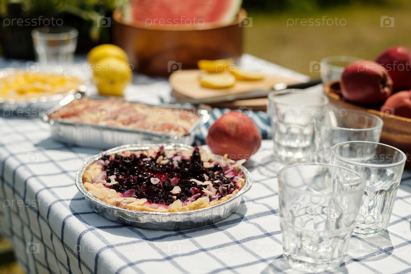 Домашний фруктовый пирог и свежие продукты расположены на открытом столе для пикника