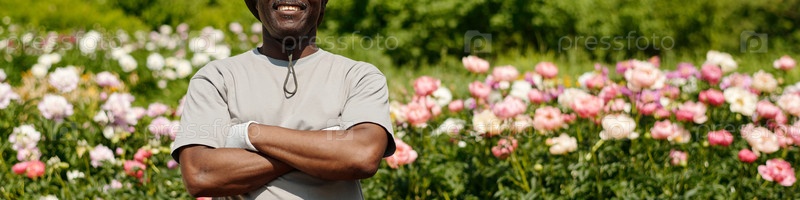 Портрет чернокожего человека среднего возраста, улыбающегося на улице и стоящего в цветочном саду