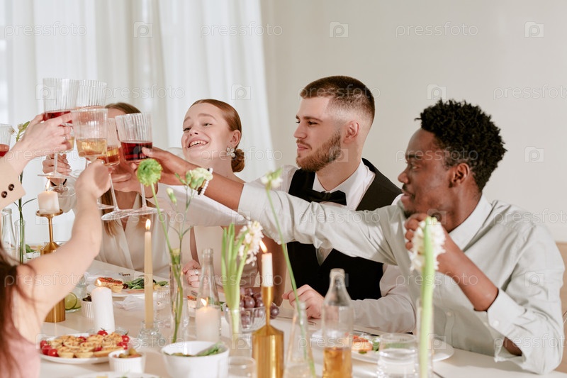 Разнообразные молодые взрослые тостируют за бокалы, празднуя свадебный прием вместе