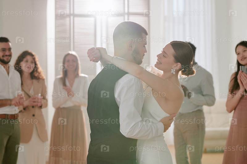 Молодые невесты и женихи танцуют в окружении различных свадебных гостей