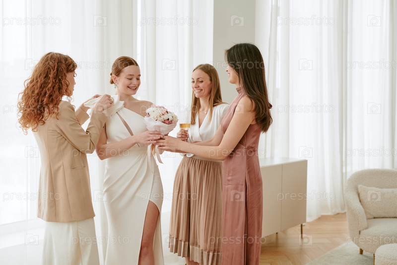 Молодые женщины празднуют свадьбу и улыбаются в помещении вместе