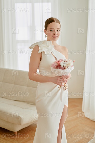 Портрет молодой взрослой женщины, держащей свадебный букет и улыбающейся в помещении
