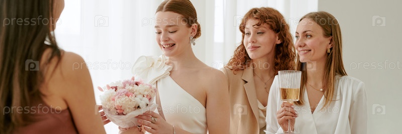 Молодая женщина улыбается, держа в руках свадебный букет с друзьями поблизости