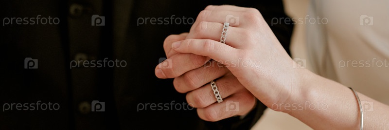 Молодая взрослая пара, держащаяся за руки и показывающая обручальные кольца вместе