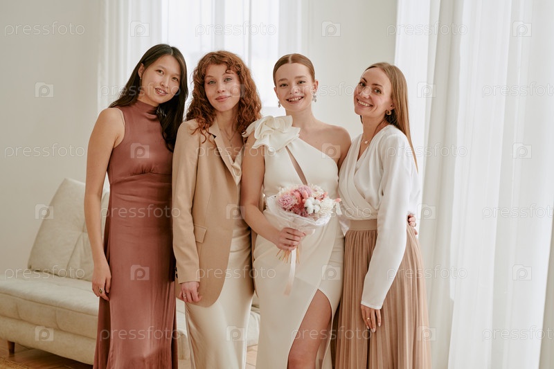 Многонациональные молодые взрослые женщины, стоящие вместе и улыбающиеся во время свадебного мероприятия