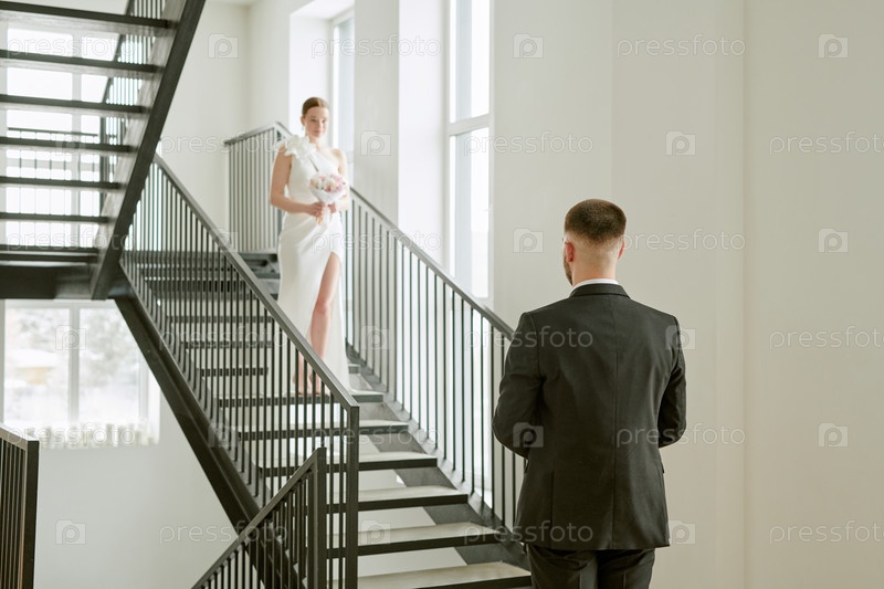 Молодая невеста спускается по лестнице к молодому жениху, ожидающему ее