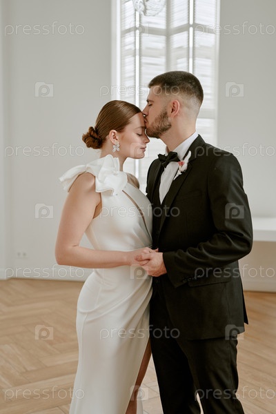 Молодой человек целует молодую женщину на лбу во время свадьбы