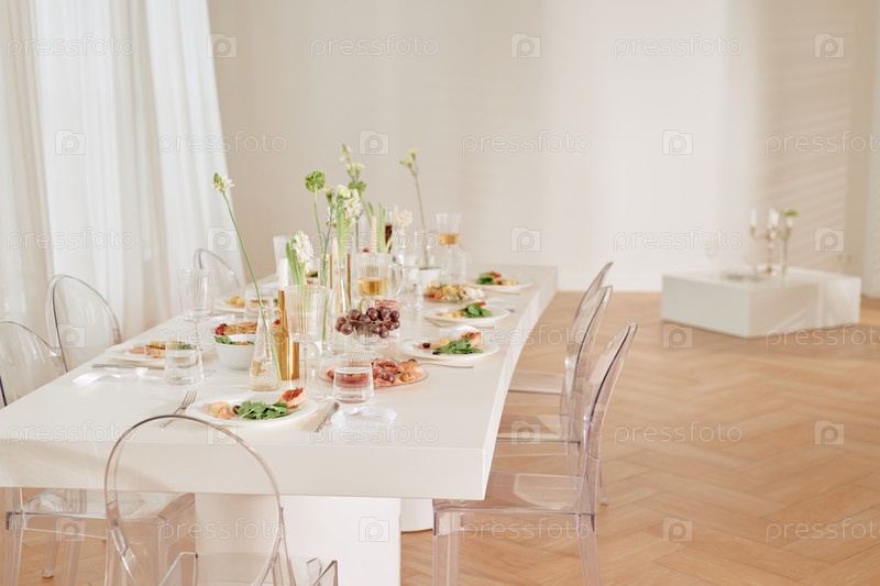 Элегантная свадебная столовая установка с тарелками с едой и бокалами, ожидающими гостей