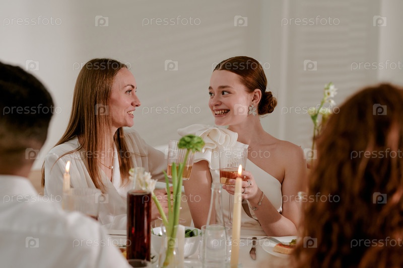 Молодые женщины улыбаются и приносят тосты во время свадебного торжества