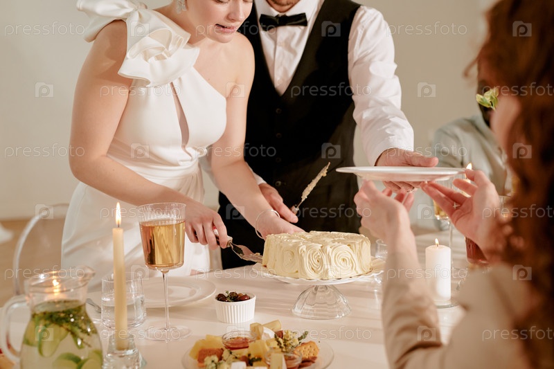 Молодые взрослые невеста и жених режут свадебный торт во время празднования
