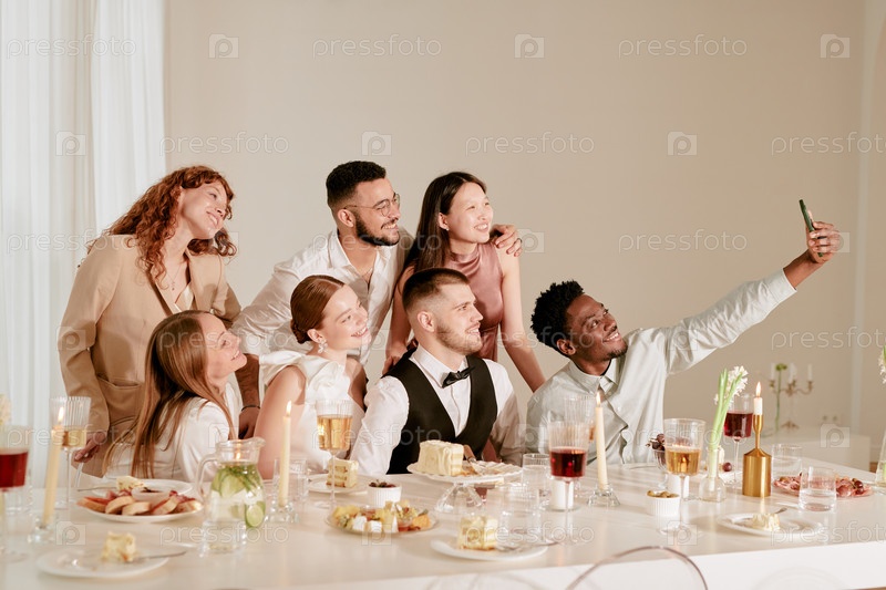 Разнообразная группа молодых взрослых, улыбающихся и делающих селфи во время свадебного торжества