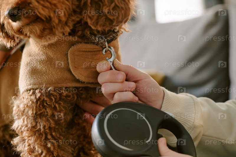 Молодой взрослый прикрепляет поводок к маленькой собаке во время первого опыта с домашним животным