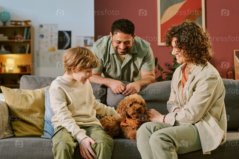 с родителями улыбаются и ласкают первого щенка дома мальчик