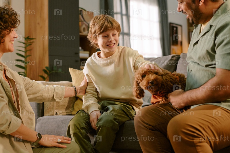 Улыбается, пока ласкает собаку с родителями наблюдающими дома мальчик