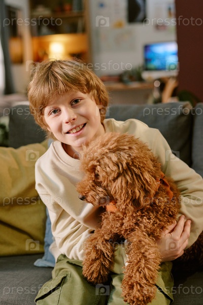 Портрет детского мальчика, улыбающегося в то время как он держит щенка дома