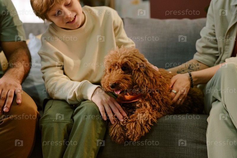 Улыбающийся, когда он ласкает собаку с родителями во время первого опыта мальчика-домашнего питомца
