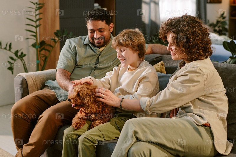 с родителями, улыбающимися во время поглаживания первого щенка дома мальчик
