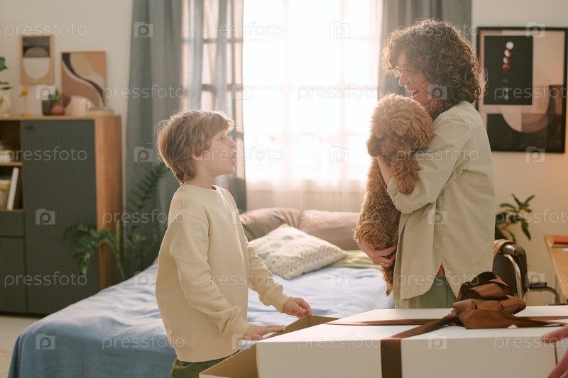 Молодой мальчик и молодая женщина приветствуют своего первого домашнего питомца