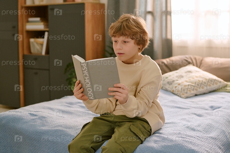 Сидя на кровати, читая психологию Книга дома для первого мальчика-домашнего питомца