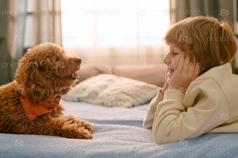 Ребенок улыбается, наблюдая за щенком, лежащим на кровати дома