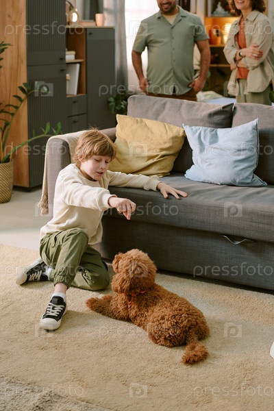 Мальчик играет с щенком, пока родители смотрят на него в гостиной