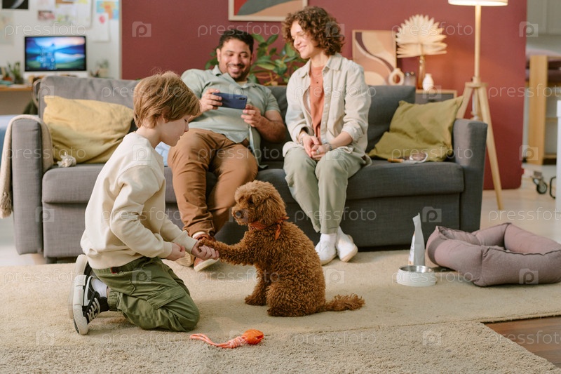 На коленях и обучение щенка, в то время как родители смотрят на диване Child