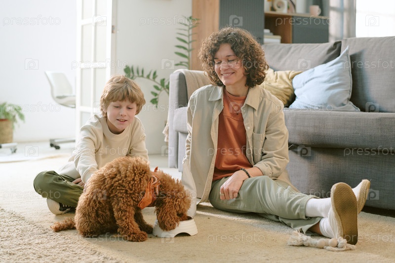Молодая женщина и ребенок связываются с первым домашним собакой в гостиной дома