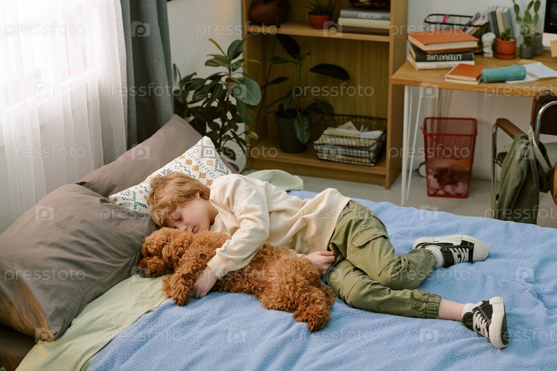 Мальчик обнимает щенка собаку на кровати Первый домашний питомец у себя дома