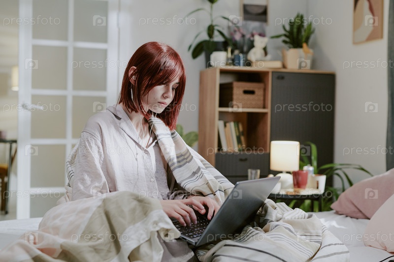 Уютный в постели с помощью ноутбука в гостиной установки человека