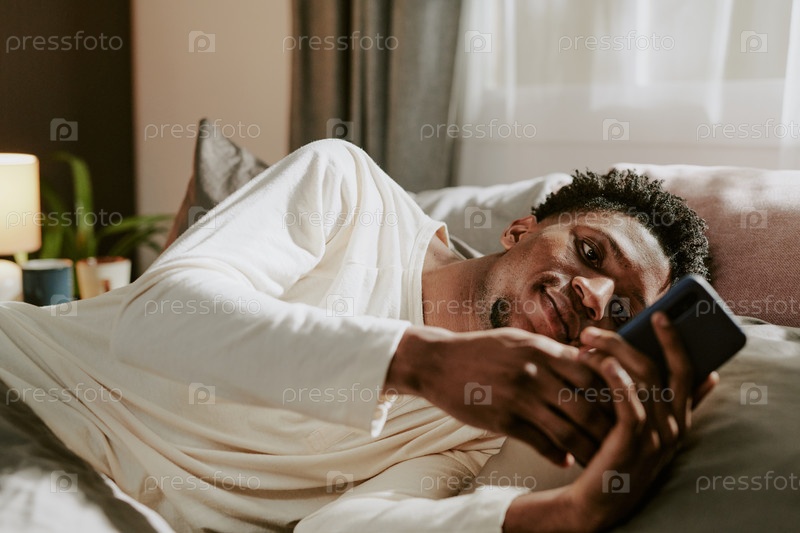 Улыбающийся молодой человек отдыхает в постели со смартфоном