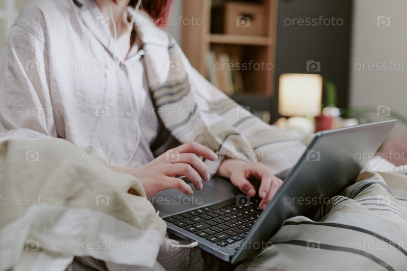 Женщина, печатающая на ноутбуке, сидя на уютной кровати