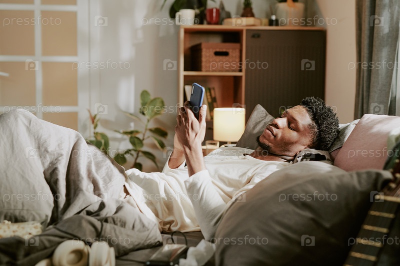 Расслабляться в постели, используя смартфон на уютный вечер