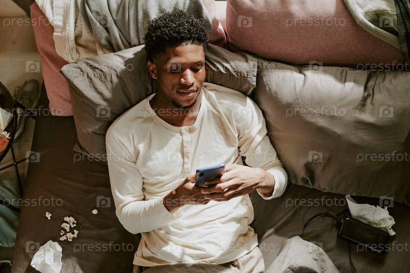 Расслабляясь в постели и просматривая смартфон в непринужденной одежде