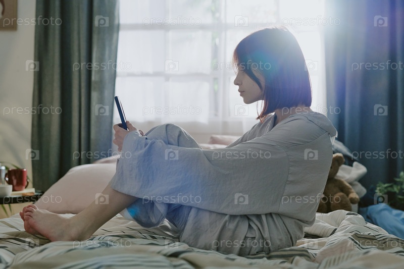 Азиатская женщина использует смартфон в уютной обстановке спальни