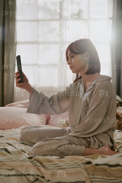 Женщина, сидящая на кровати и держащая смартфон