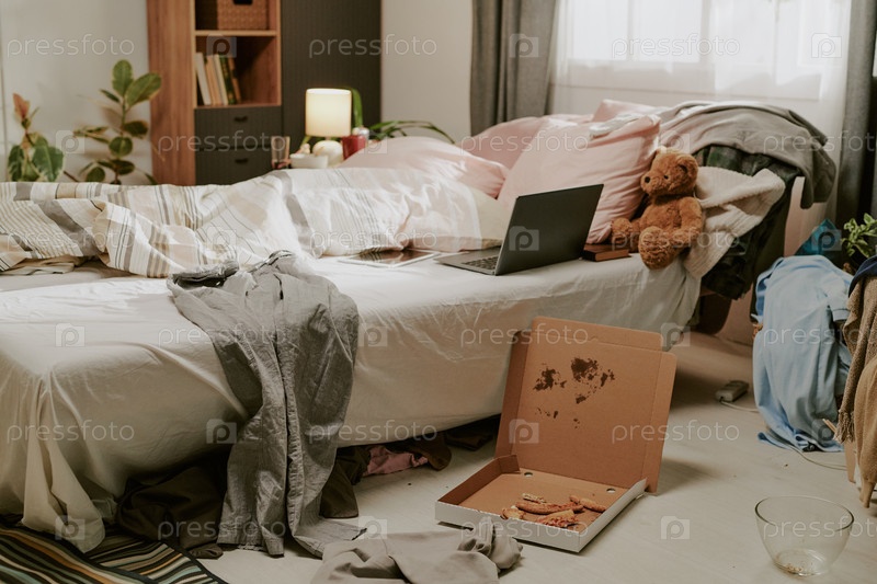 Беспорядочная спальня с ноутбуком и рассеянностью