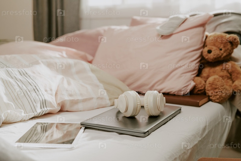 Мягко освещенная комната с плюшевым медведем и электроникой
