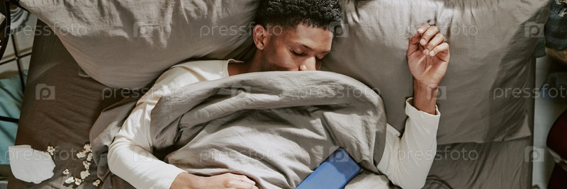Спящий мужчина держит пульт дистанционного управления Расслабляясь в постели