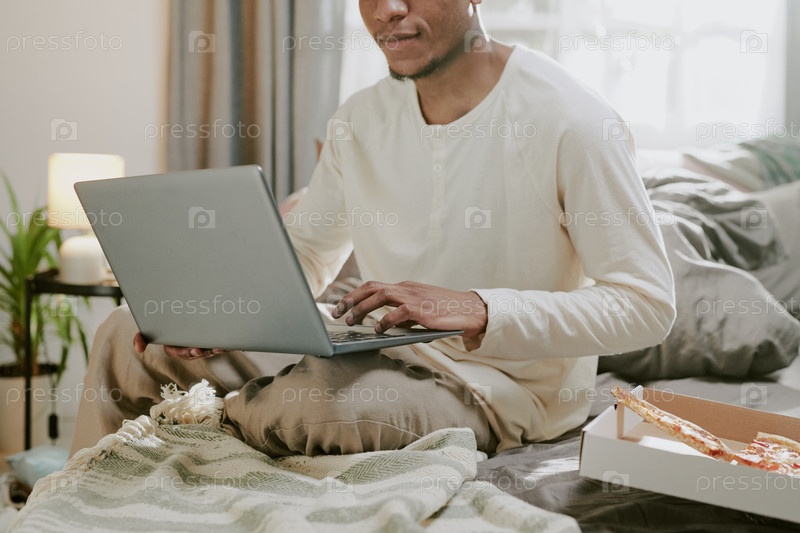 Удаленная работа из дома с ноутбуком на кровати