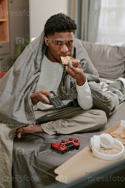 Съесть пиццу, смотря телевизор в современной гостиной