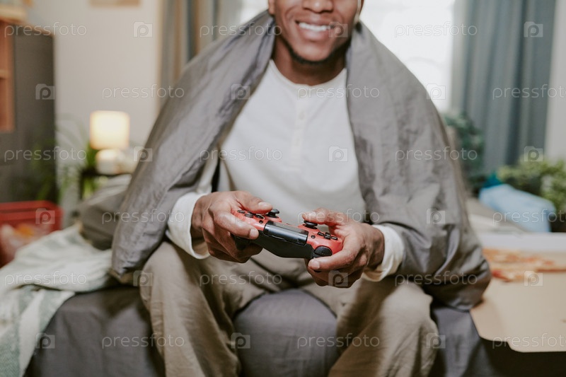 Портрет улыбающегося мужчины, играющего в видеоигру на диване