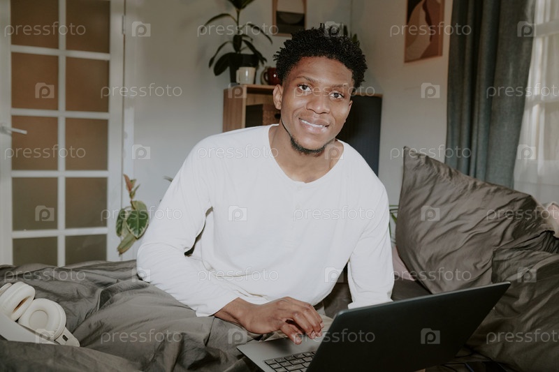 Портрет улыбающегося мужчины, работающего на ноутбуке в уютной комнате