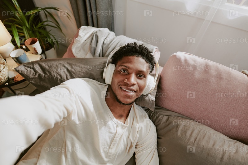 Портрет человека, отдыхающего на диване и слушающего музыку