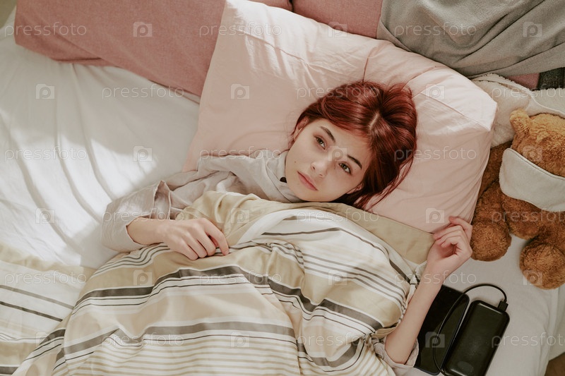 Пенсивная девушка, лежащая в постели и держащая одеяло
