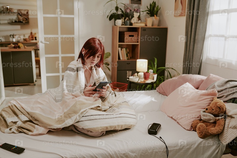 Женщина отдыхает в постели, используя смартфон