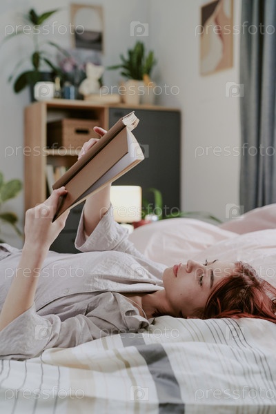 Женщина отдыхает, читая книгу в спальне