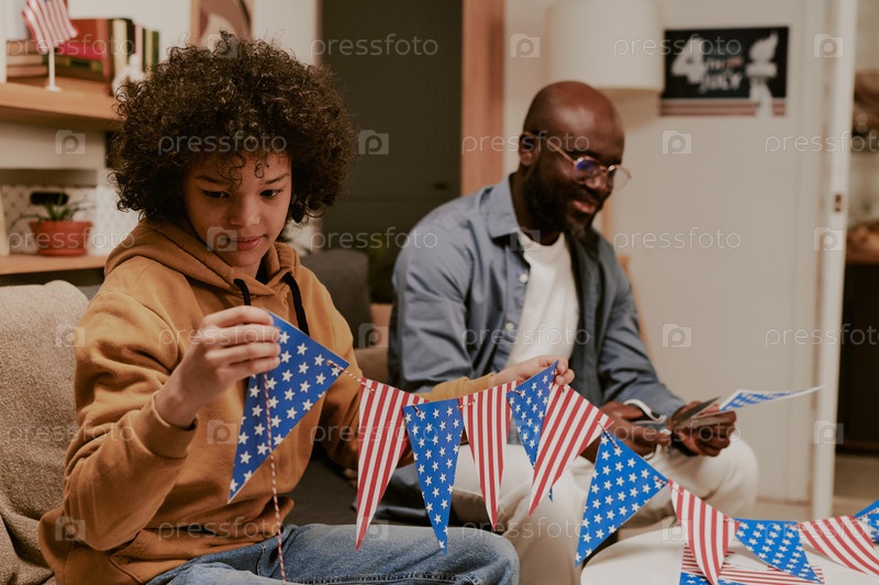 Подросток и чернокожий мужчина среднего возраста украшают комнату с американскими флагами