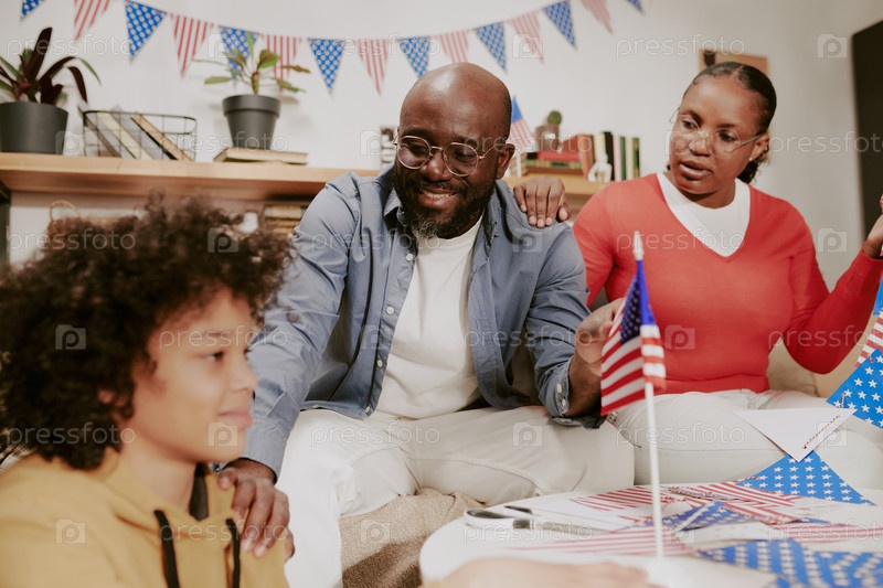 Семья празднует День независимости с американскими флагами в помещении
