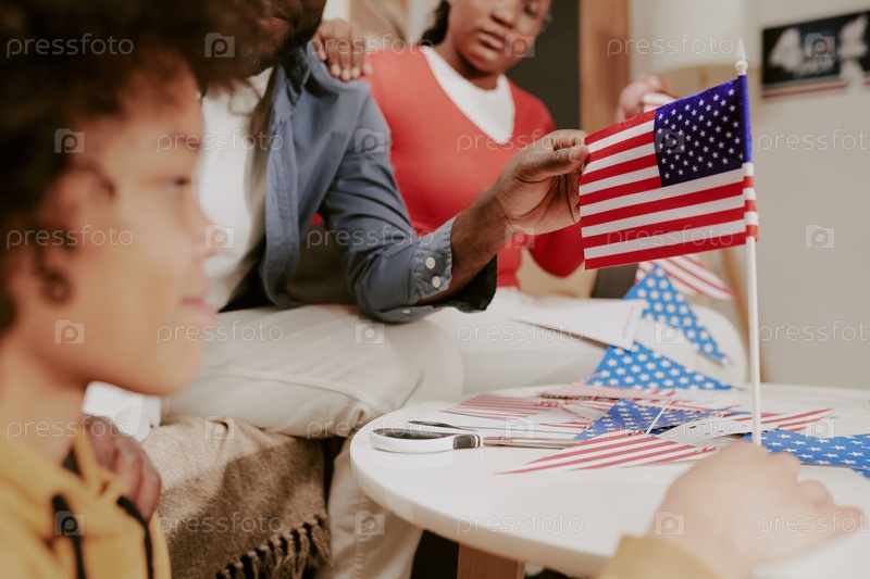 Черная семья собирает патриотические украшения с американскими флагами в помещении
